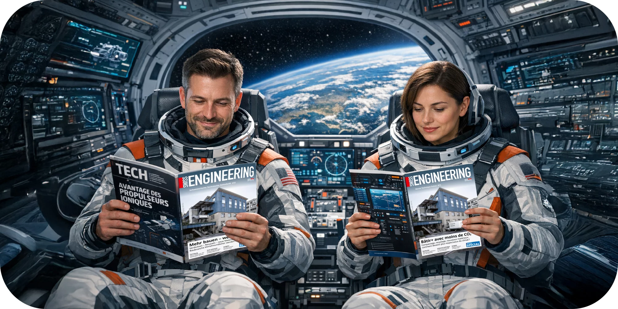 John Marshall et Betty Trouffy, fidèles lecteurs de Swissengineering RTS et STZ en pleine lecture des deux dernières éditions et des articles sur la sous-traitance et le SIAMS. La trajectoire est correcte et le pilotage automatique fonctionne. Atterrissage prévu à Moutier le 21 avril à 9h00.