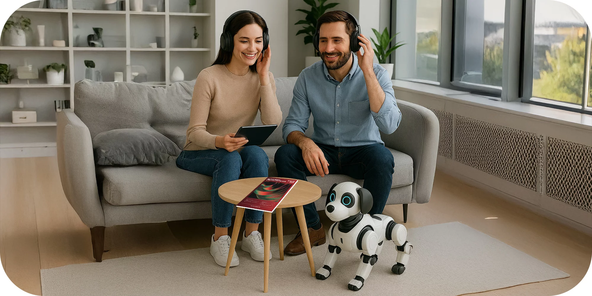 Sandra et Thomas écoutent le podcast de la Revue polytechnique. Ils semblent très heureux d'entendre que le SIAMS est sur les bons rails. Kiki le chien leur tient compagnie sans les déranger.