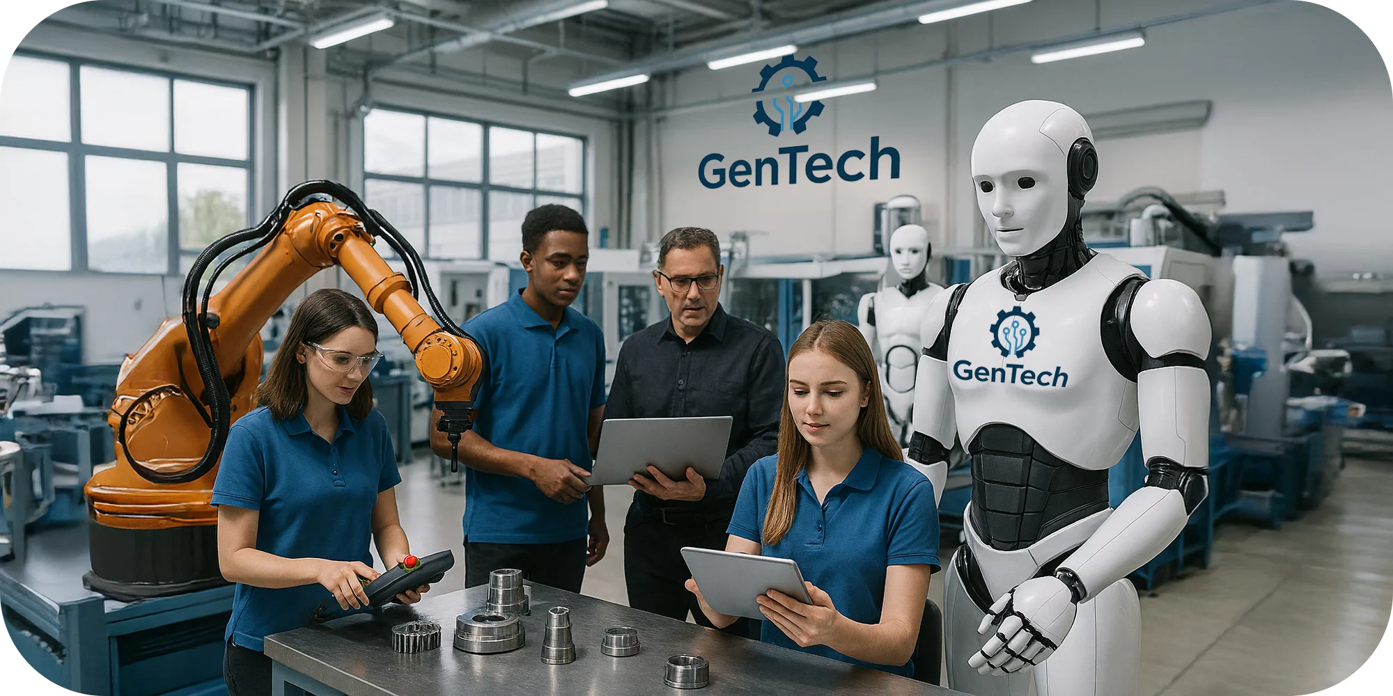 Image d'illustration des ateliers GenTech. Ni le logo, ni les ateliers, ni les robots ni les personnes ne correspondent à la réalité 😂😂.