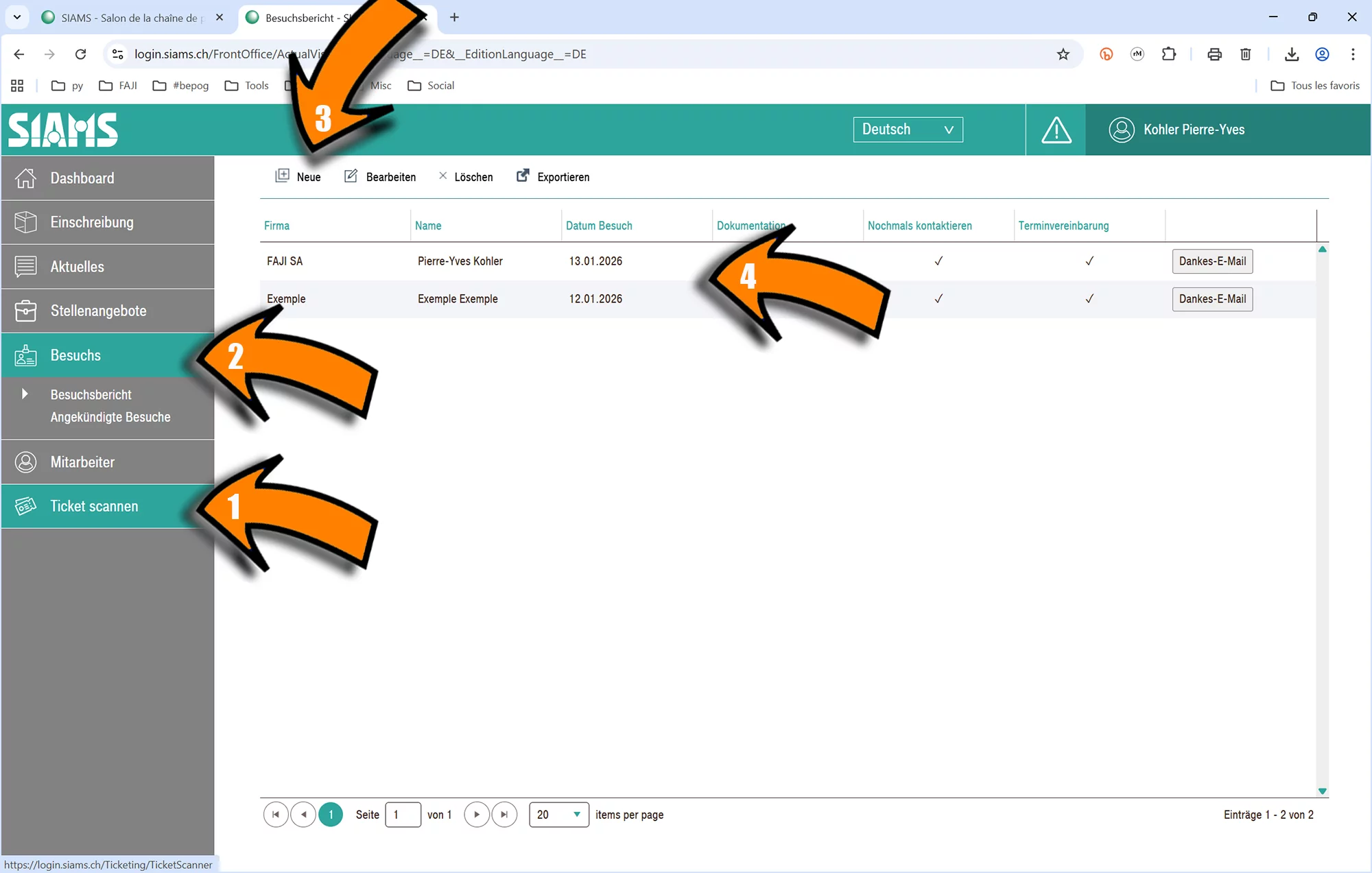 Um das Ticket zu scannen, öffnen Sie die SIAMS-Website im Ausstellermodus. (Zur Erinnerung: Hier können Sie Konten für Ihre Mitarbeiter erstellen). Wählen Sie «Ticket scannen» (1) und das System öffnet Ihre Kamera, scannt das Ticket und speichert die Daten in der Datenbank.