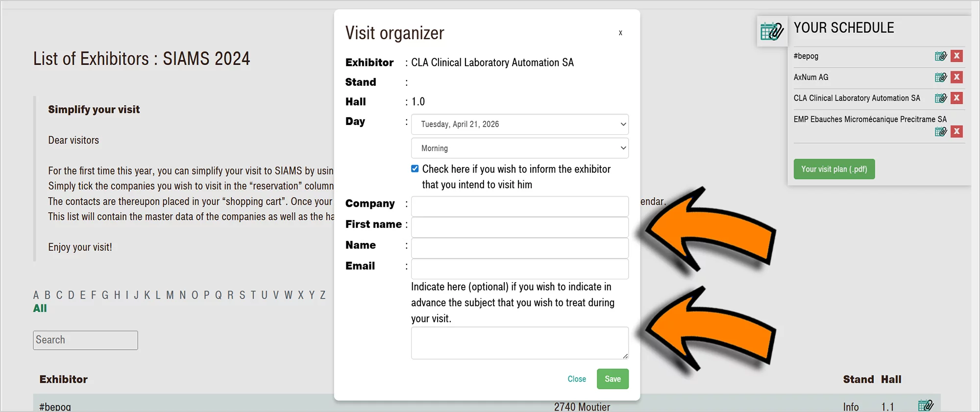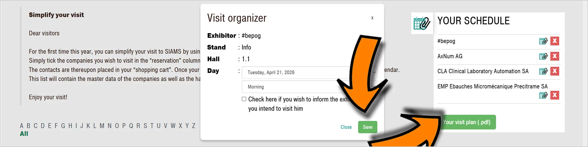 Choose the day and period (morning or afternoon) and save. The contacts will be added to your ‘basket’. You can also tick the box to inform the exhibitor of your visit (see below).