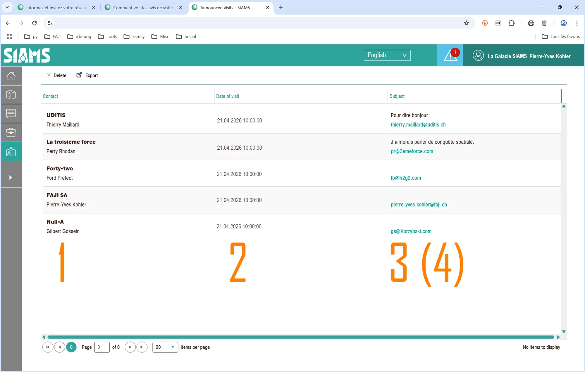 A page will open where you can see the visit intentions: Company, first and last name (1), planned date and time (2), contact email address (3). If the potential visitor has indicated this, you already have an idea of what the visit will be about (4).